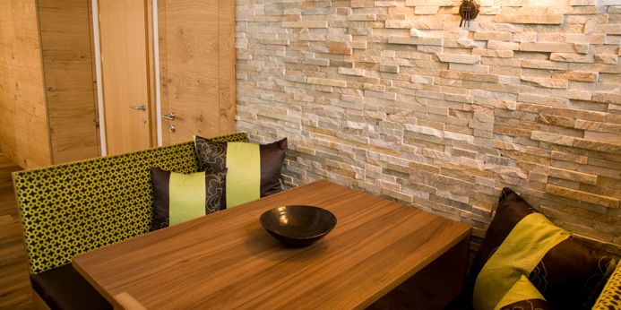 Vom Tischler mit viel Sorgfalt mit Eichenholz eingerichtet. Die Kombination von Stein, Holz und edlen Stoffen verleiht diesem - unserem neuesten - Appartement eine besondere Gemütlichkeit und Wärme.